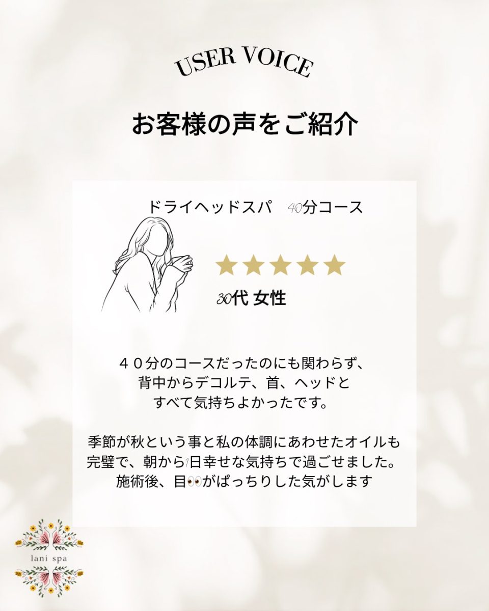 40分のコースだったのにも関わらず、背中からデコルテ、首、ヘッドとすべて気持ちよかったです。季節が秋という事と私の体調にあわせたオイルも完璧で、朝から1日幸せな気持ちで過ごせました。施術後、目👀がぱっちりした気がします